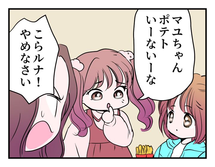 実はルナちゃん、ファストフードのフライドポテトが大好物だそうです……。しかし今は、ダイエットのためガマンの日々。そんななかお友達がフライドポテトを食べていたら、もちろん欲しくなってしまいますよね。「大好きなお友達にわけてあげたい」というマユちゃんの純粋な気持ちにほんわかしたり、ウルッときたりしていたママたち。この後はもちろん子どもたち2人で仲良く食べる……はずですよね?