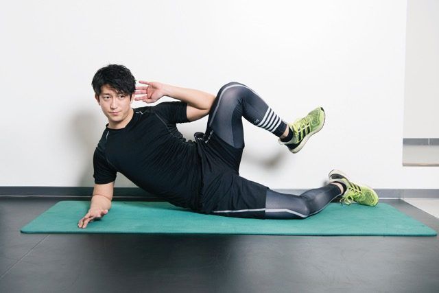 (1)肩とひじを直角にして床に着いて横向きに寝て、体の下側の脚を軽く曲げ、反対側の脚を上げて真横に伸ばす