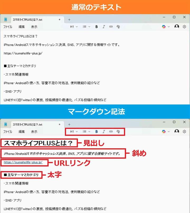 Windows 11を24H2へアップデートすると、メモ帳に「マークダウン記法」やAI機能「Copilot」などの機能が追加され、昔のようなシンプルなテキストエディタではなくなってしまいます。これらが不要だと感じる場合は、メモ帳画面の右上にある設定(歯車マーク)から「書式設定」や「Copilot」のスイッチをオフにしましょう。