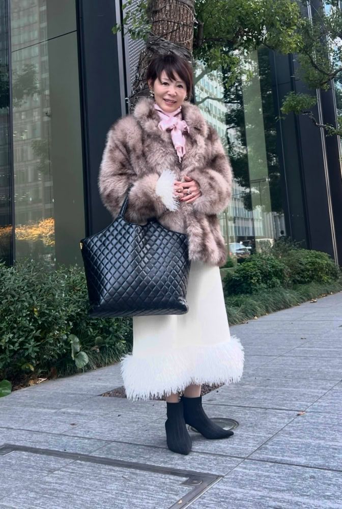 この日は素敵なあの人のイベントに参加していた松浦恵美子さん。「自然豊かなアラスカをイメージしてアニマルっぽいマーブル模様なファーブルゾンがコーデの主役。トップスとスカートはふわふわな白のフリンジがかわいいセットアップでパーティーライクに仕上げました」