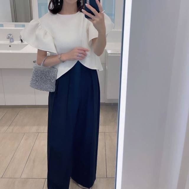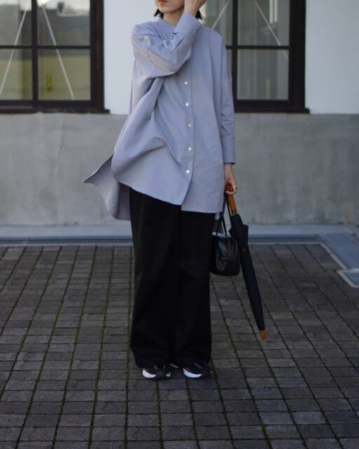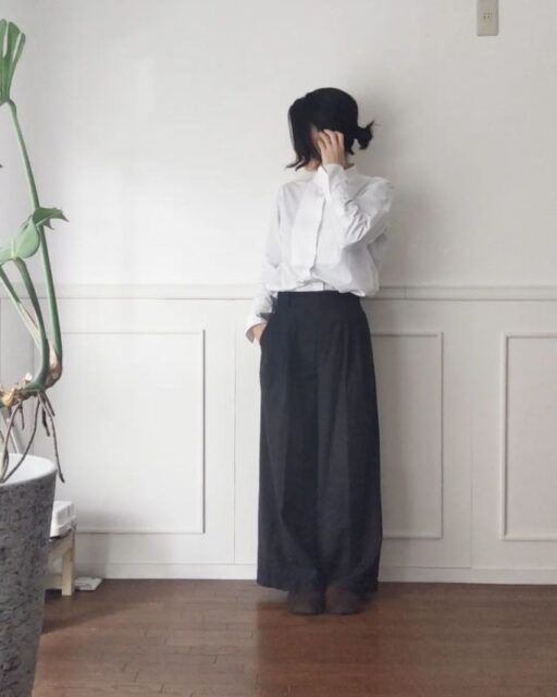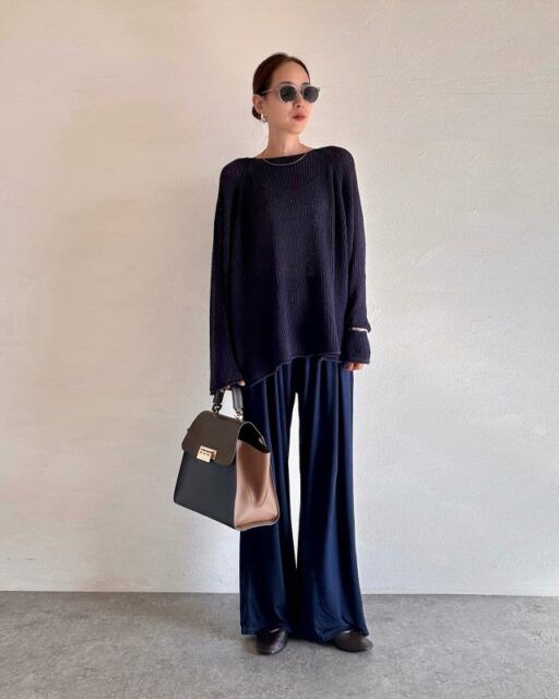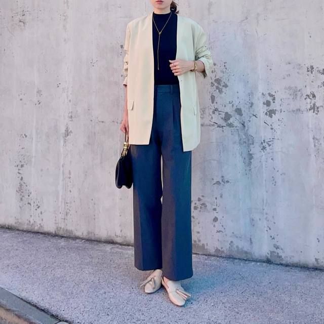 ネイビーのパンツが本領を発揮するのが通勤スタイル。ゆるっとしたワイドシルエットを選んでも、ネイビーならダラしなくならずコーデがきちんと見え。ジャケットや襟付きシャツを合わせてハンサムに着こなしても素敵です。
