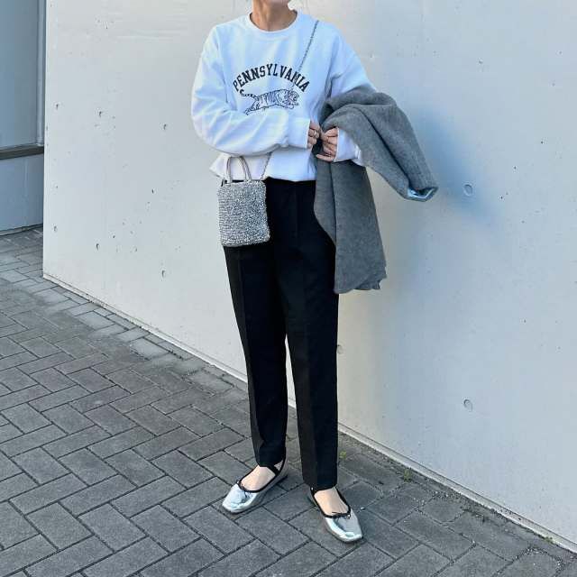 黒パンツは「カジュアルなトップス」と相性バツグン。ロゴ・プリントのTシャツやスウェットなどラフなトップスも、黒パンツを合わせるだけで印象がガラリとチェンジ。きれいめ感が加わり、大人っぽいカジュアルコーデに決まります。