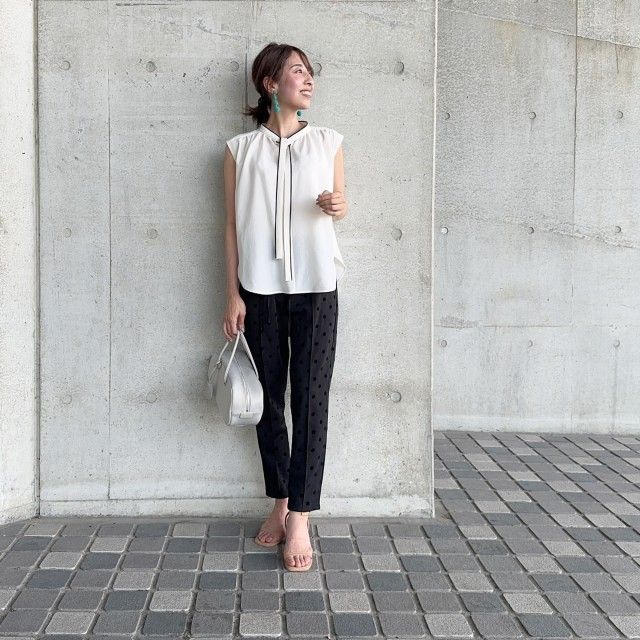 春夏のシアートップスや袖なし服など「肌見せ服」には黒パンツがうってつけ。クリーンなパンツがコーデを引き締め、大人っぽい装いに。トップスの露出感を軽減しながら、全身のバランスが整います。