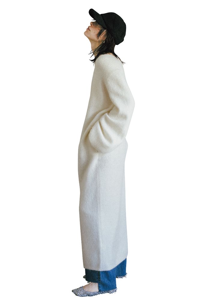 切りっぱなしのすそをのぞかせてガーリーな白ワンピにスパイスをひとさじ。立体的なそでにより、白いニットワンピースの間のびを払拭。フロント部分だけ裁断したような、イレギュラーなカットオフデニムは、少量効かせるだけでも十分なエッジに。キャップをかぶってさらにカジュアルダウン。
