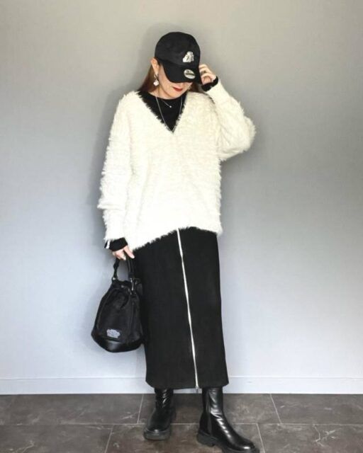 黒トップスと同じく無彩色であるグレーのカーディガンは馴染みがいいものの、コーデは重たく見えがちに。そこでおすすめなのが、カーディガンをふわふわとしたニットで取り入れること。