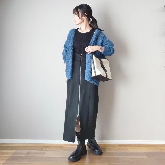 トップスとカーディガンを同じ黒色で重ね着することで、上半身に統一感が生まれシックな装いに。アンサンブルのように見えるためクリーンなコーデに仕上がります。