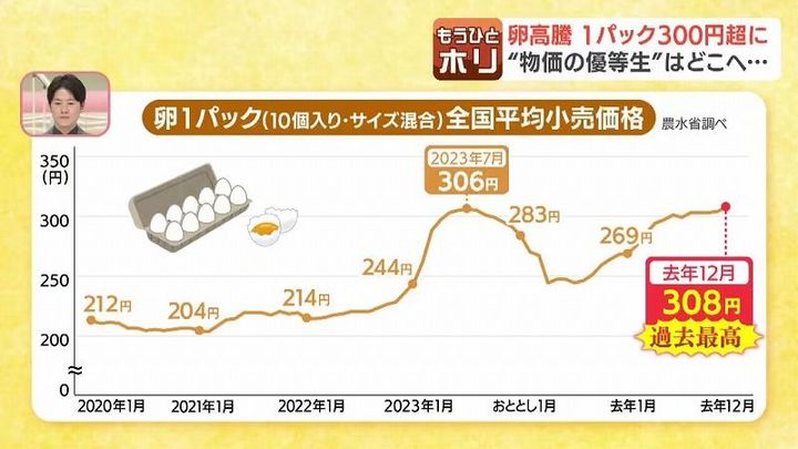 「エッグショック」と言われた2023年の7月の306円を超え、過去最高値を更新しました。