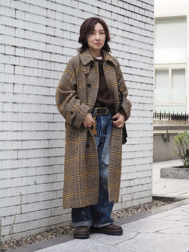 ブラウンのニットとユーズド感のあるクラッシュデニムを合わせたラフなスタイリングに合わせたのは、「ジャーナルスタンダード」のロングコート。「テレビで見かけて一目ぼれしたアイテムです。インターネットで調べたら見事ヒットしたので購入しました」。イエローをきかせたグレンチェックが冬の装いを華やかに。