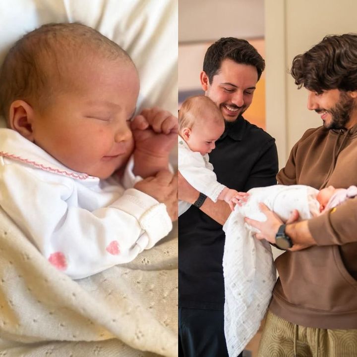 いとこ同士が対面するキュートなシーンも。イマン王女の兄フセイン皇太子(写真左)とラジワ皇太子妃との間には2024年8月3日にイマン王女(叔母と同名)が誕生しており、この度生まれたベビーであるアミナ王女とは従姉妹の関係にあたる。