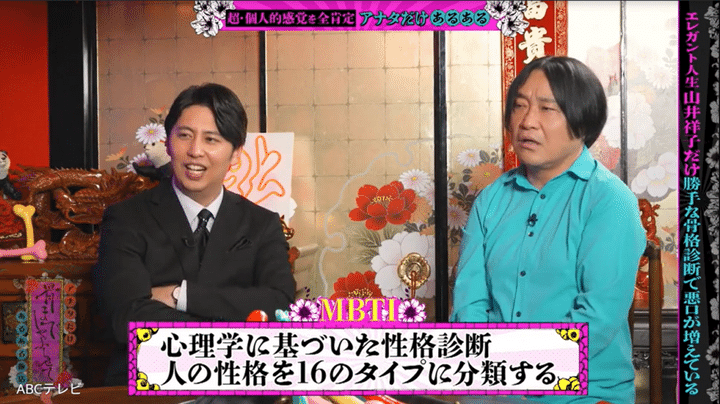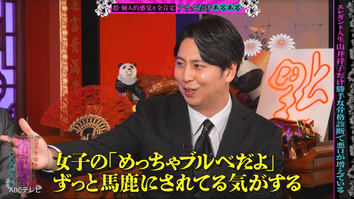 そんな山井が語った“汚い膿みたいに溜まった独自あるある”の1つは、骨格診断やパーソナルカラー診断、MBTI診断、顔タイプ診断といった“診断”関係だ。彼女いわく、「普通にしゃべっていても、『祥子は骨格○○だからこういう服が似合うよ』とか勝手に診断される」「勝手な診断で悪口が増えている」という。また、「イジられるMBTIがある」らしく、「嘘のMBTIを言うようにしている人もいる」のだとか。