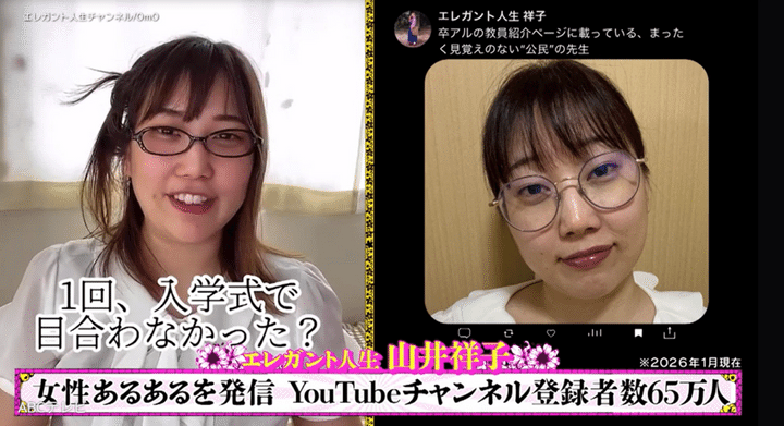 山井は、SNSで女性の“あるあるネタ”を発信しており、エレガント人生のYouTubeチャンネル登録者数は、2026年1月時点で65万人! 多くの人に支持されているが、「コントにできるようなキレイなあるあるはマジで一部しかなくて。汚い膿みたいに溜まったあるあるが本当にパンパンなんですよ今。クサいやつが!」という。