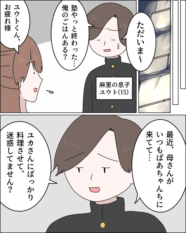 しばらくすると、麻里さんの息子ユウトくんが「ただいま~。塾やっと終わった・・。俺のごはんある?」と疲れた様子で義実家にやってきました。「ユウトくん、お疲れ様」と出迎えると、「最近、母さんがいつもばあちゃんちに来てて・・ユカさんにばっかり料理させて、迷惑してません?」と心配そうに言いました。