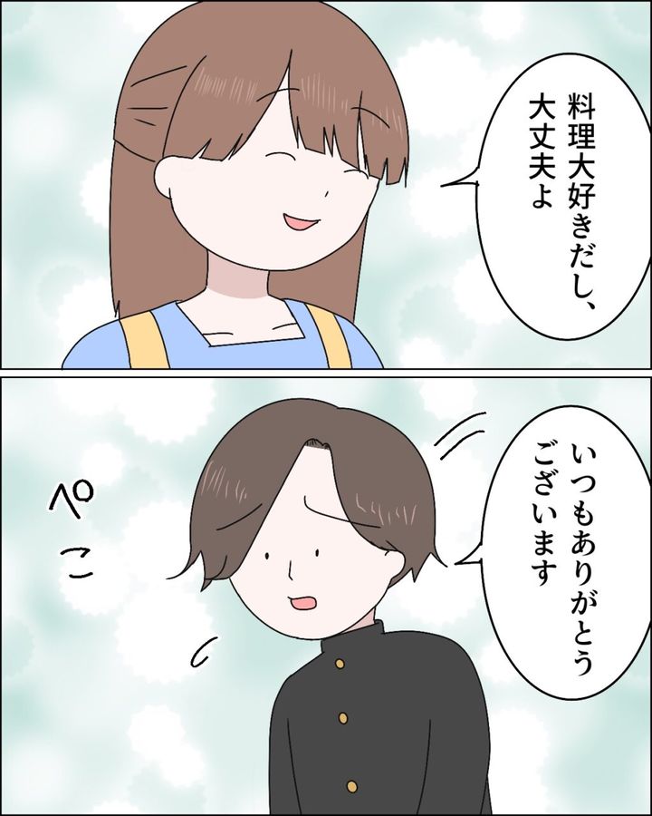 ユウトくんの気遣いを嬉しく思いながら「料理大好きだし、大丈夫よ」と言うと、「いつもありがとうございます」と申し訳なさそうに頭を下げるユウトくん。