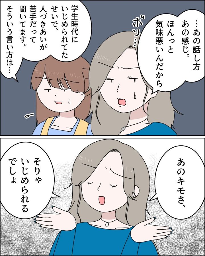 知佳さんが居なくなると、すかさず麻里さんが「・・あの話し方、あの感じ。ほんっと気味悪いんだから」とボソッと呟きました。「学生時代にいじめられてたせいで、人づきあいが苦手だって聞いてます。そういう言い方は・・」と遠慮気味にたしなめたものの、麻里さんは「あのキモさ、そりゃいじめられるでしょ」とさらり。