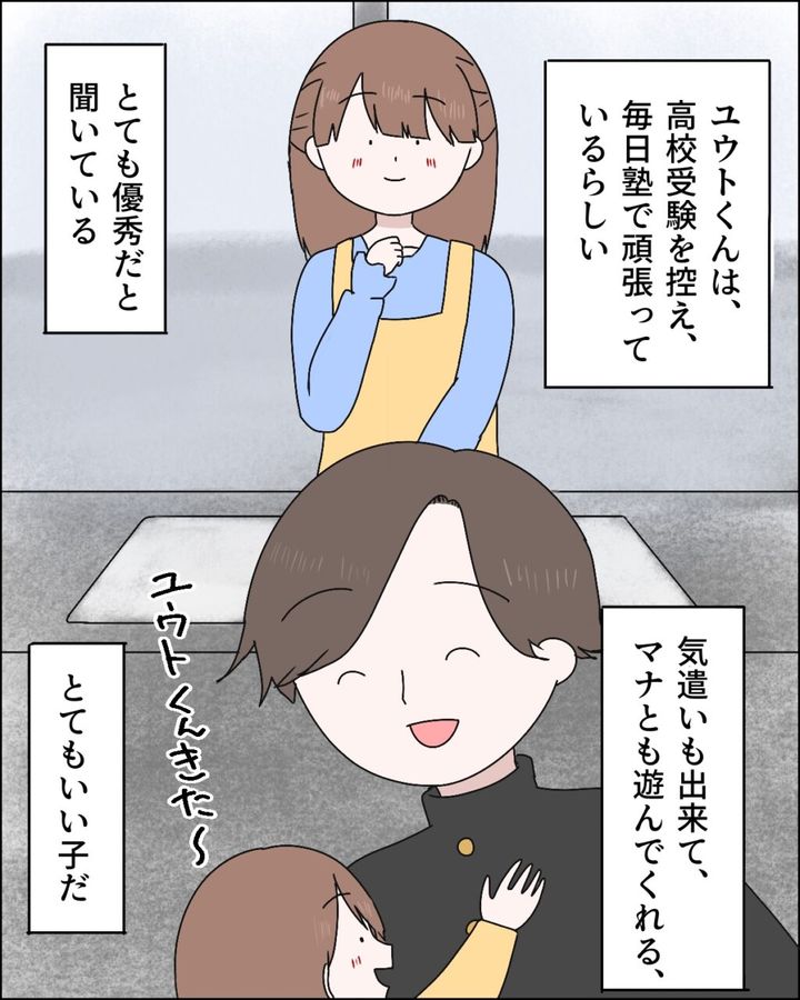 ユウトくんは、高校受験を控え、毎日塾で頑張っているらしい。成績もとても優秀だと聞いており、気遣いもできて、マナとも遊んでくれる優しくてとてもいい子です。失礼ですが、母親の麻里さんとは大違いです。