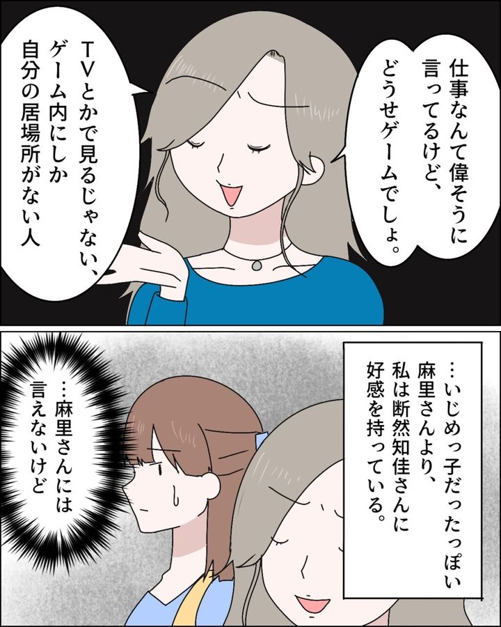 さらに、「仕事なんて偉そうに言ってるけど、どうせゲームでしょ。テレビとかで見るじゃない、ゲーム内にしか自分の居場所がない人」といつものように知佳さんをバカにしたように言い捨てる麻里さん。ひどい言葉の数々から、麻里さんはいじめっ子だったのではと思えてしまいます。面と向かっては言えないものの、私は麻里さんよりも断然知佳さんに好感を持っているので、こうやって麻里さんが知佳さんのことを悪く言うのはいい気がしません。