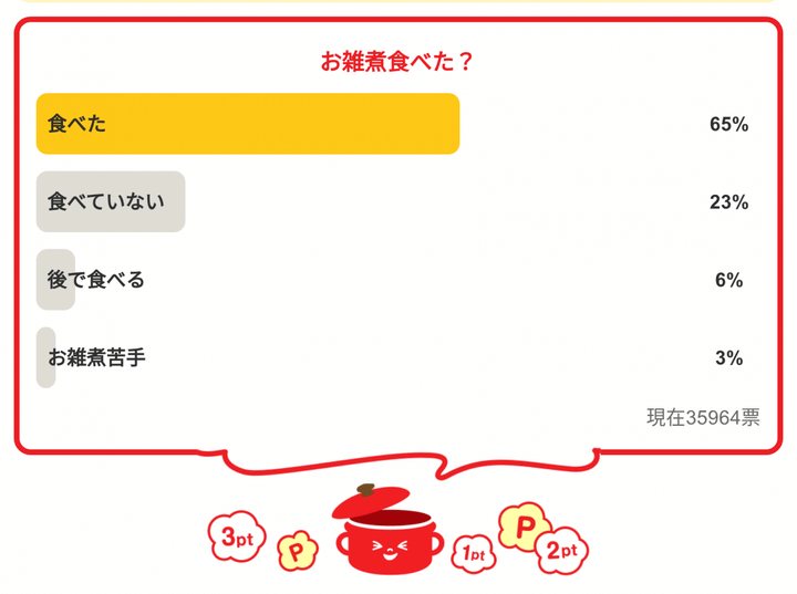1月3日に行われたアンケート、お雑煮を「食べた」が1位でした。お正月の定番として、お雑煮は多くの家庭で欠かせない存在になっており、年の始まりを感じる一杯ですね。