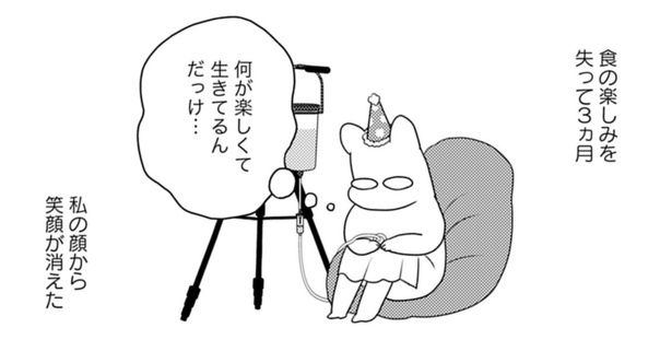 そうなると、食について考えるのを止めるようになっていたんですが、飲食ができないって、とにかく暇なんです。暇なら仕事でもすればいいんですが、デスクワークの私はもともと常に何かを口にしながら仕事をしていたので、それがないと集中できなくて…。テレビや漫画を見ていても、食のことがどこからでもすぐ目に入ってくる。おいしそうだな…でも、私は食べられないんだなあ。つまらないなあ。何のために生きているんだろう…と感じ、笑顔が消えました。