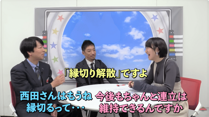 西田氏は続けて「吸収でも合併でもないっていう論理を成立させるには、もう少し幅広い政治家の参加がこれからみられるか、っていうのが重要だと思います。例えばここに自民党の一部の人たちとか。れいわ新選組とか、辞め維新の人とか」と語り、「そういう大同団結みたいなことがあると、右か左かなのか、二つの極っていうのが分かりやすく分かれていくことになりますよね。そうなると政界大再編みたいなものに繋がっていく可能性がゼロじゃない」と語った。