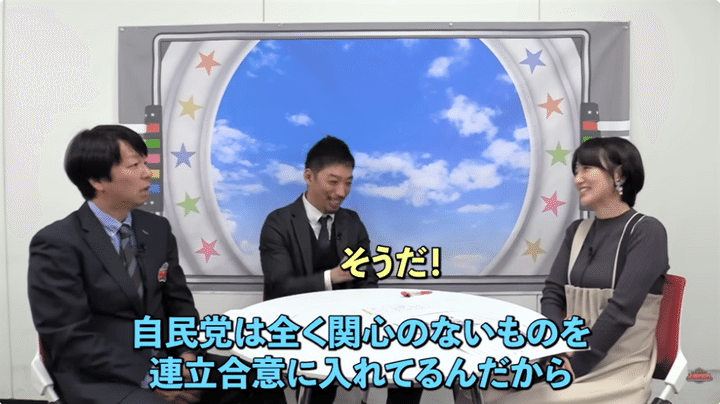 さらに、「これ野合っていう人いるけど、野合だったら自民と維新の連立だって野合だよ。だってさ、定数削減とか副首都構想とか、自民党は全く関心のないものを連立合意に入れてるんだから」と述べる青山氏に、西田氏も笑みを浮かべて「そうだ!」と国会議員のような(?)合いの手を繰り返す。