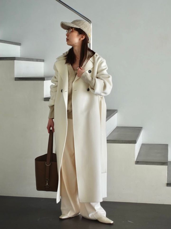 「ホワイト×ベージュでまとめたお気に入りのコーディネート。大胆な着丈のロングコートから、あえてフードを出してハズすバランスが可愛い! ボア素材のキャップを合わせることで遊び心をプラスして、テイストMIXな着こなしに仕上げたのもポイントです」
