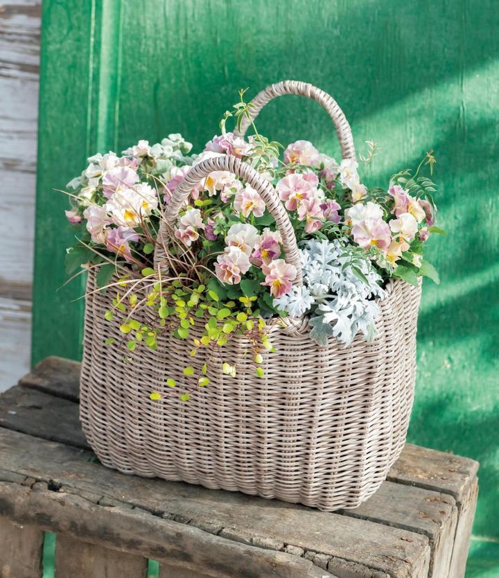 バスケットに合う王道の花といえばパンジー&ビオラ。今回は優雅な雰囲気のビオラ5株と、5種のリーフ類を植え込みました。ビオラでボリュームを出し、リーフ類をバスケットからあふれるように植え込むと、ナチュラル感がアップします。このバスケットは自然素材に見えますが、実はプラスチック製。しっかりした作りで深さもあるので、底にゴロ石を高さ2/5程度入れています。