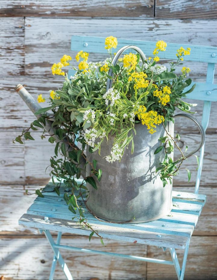 メインは、早春に咲くナノハナを思わせる黄色のアリッサム。しだれて咲く白花のスーパーアリッサムも入れて、さわやかな色合いの寄せ植えにしました。器として使ったのは、アンティーク風のジョウロ。もともと水やりができるジョウロで底穴があいていなかったので、植えつける前にドリルで穴をあけ、高さ2/5程度のゴロ石を入れています。ジョウロから水があふれるようなイメージで、花とリーフを配置し、つるの伸びを調整して植えるのがコツです。