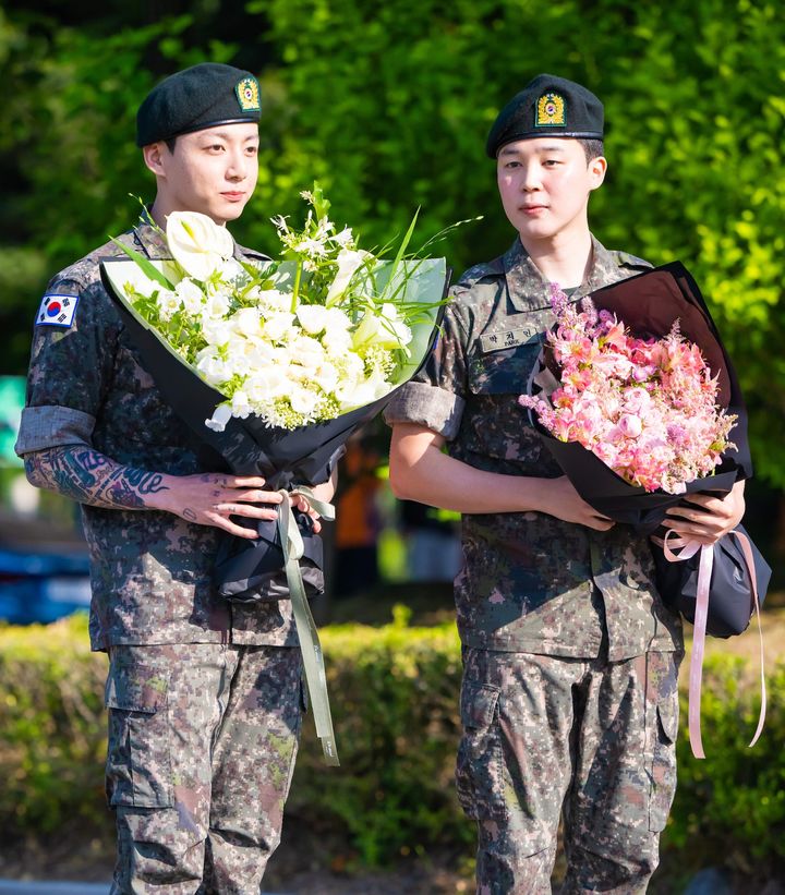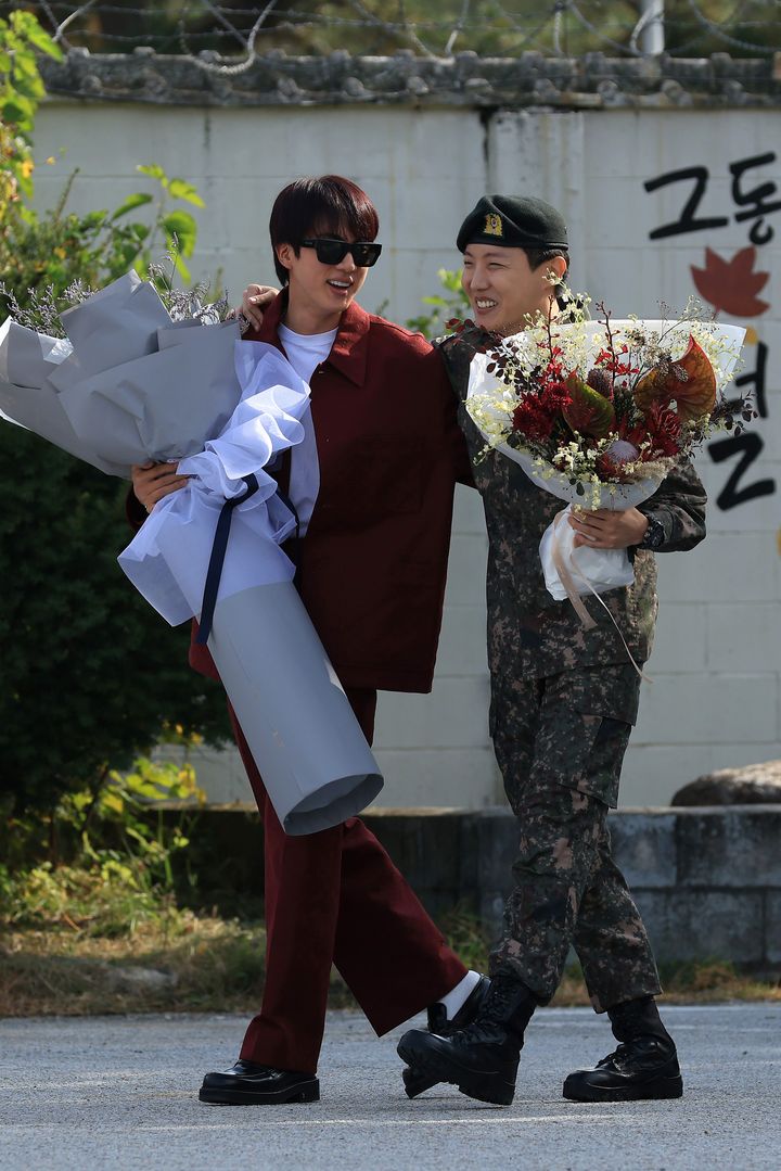10月17日、J-HOPEがグループ2人目として除隊。JINが大きな花束を持ってお出迎え!