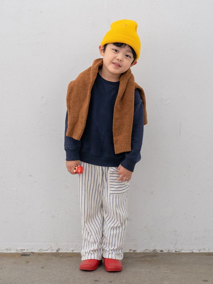 ワンポイントロゴが映えるイエローのニット帽で、元気をチャージ! 肩にかけたブラウンのカーディガンでマイルドに仕上げ。