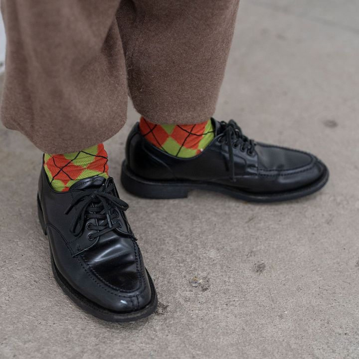 ブラックのレザーシューズでとことんマニッシュな足元にまとめ。アーガイル柄のソックスが、挿し色役にぴったり!
