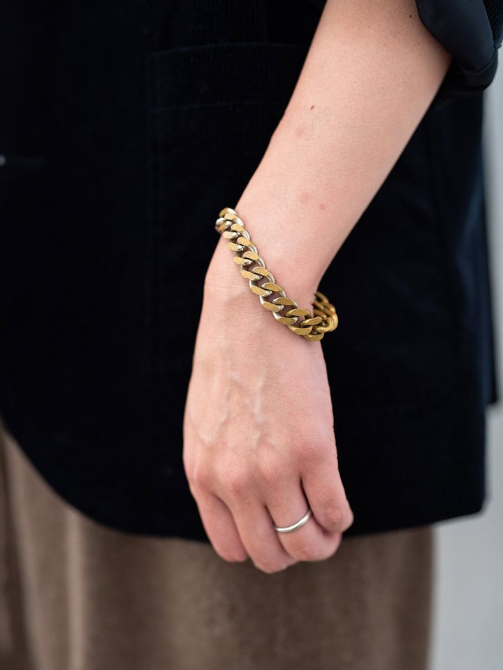 チェーンブレスレットとリングが手元のアクセントに。メンズライクなコーディネートに、レディなエッセンスをひとさじ。