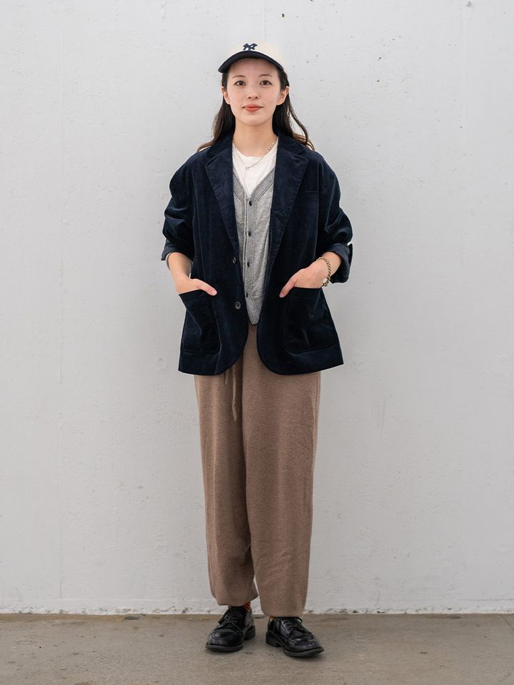 ジャケットスタイルをスポーティなキャップで抜け感を演出! インナーのホワイトを拾って、統一感も忘れずに。