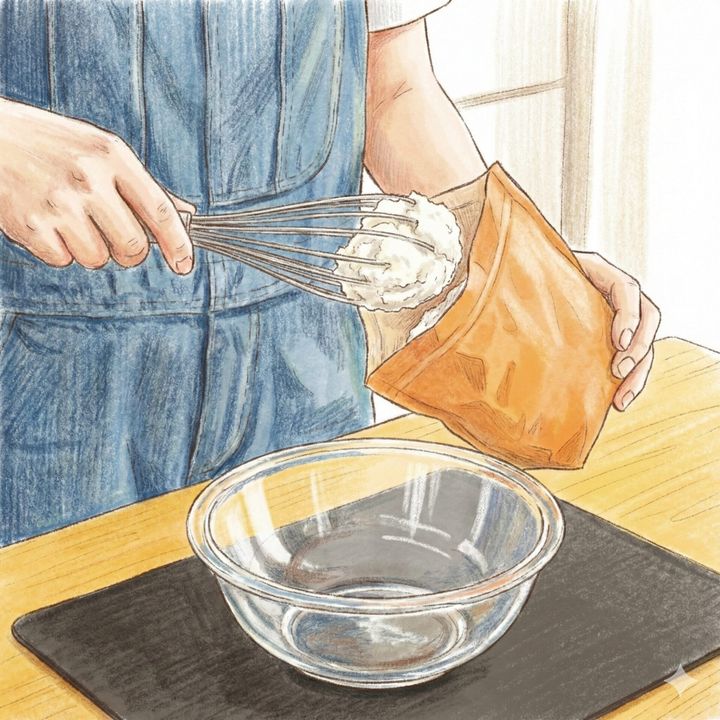 泡立て器で「くるくる」!こぼさない粉物の取り出し方