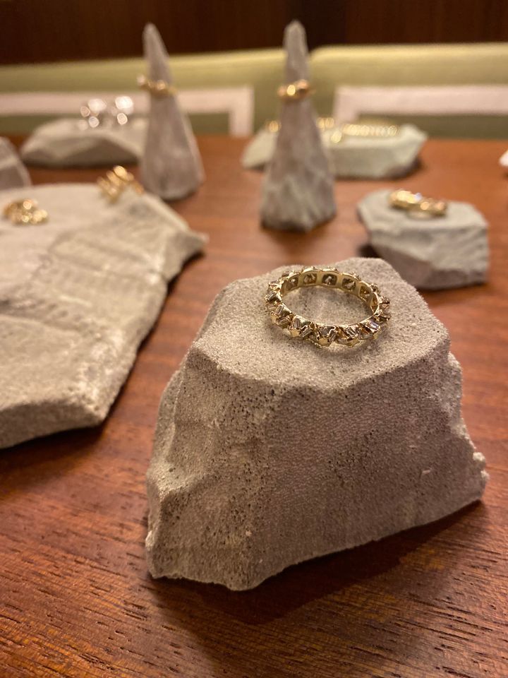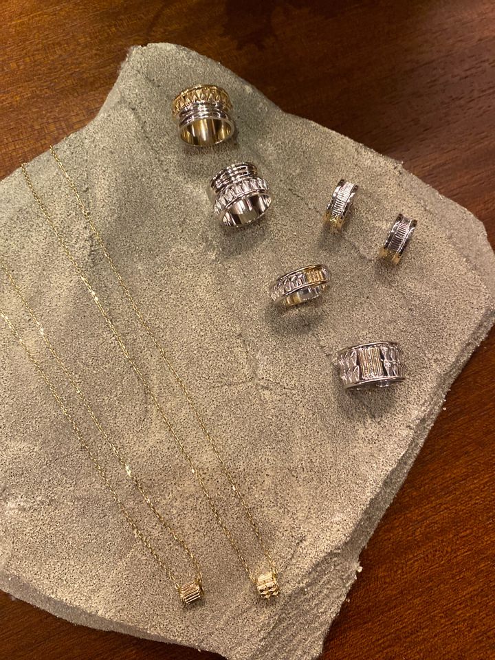 古代ギリシャ・ローマ建築の柱や神殿、西アフリカに見られる宗教建築を思わせるフォルムは、まるで発掘されたばかりの遺物のよう。装飾としてのジュエリーではなく、身体を飾る“レガリア(象徴的装身具)”としての意味合いが強く感じられます。存在感はありながらも、重ねづけできる繊細さも兼ね備え、手仕事を感じるクラフトが好きな私の好みに、まさにぴったりでした。デザイナー、ルースさんは太陽のように温かく、ポジティブなエネルギーにあふれる方で、そんな彼女の人柄もデザインに投影されているような気がします。
