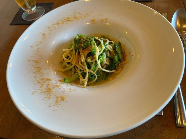 そして、旬野菜とイタリア産カラスミのペペロンチーノ。目に飛び込んでくるような青菜の色と、カラスミの淡黄色が晴れやかなタリオリーニ。スープ仕立てのソースは、最後まで旨みが凝縮されています。