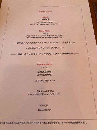 ランチコースは、前菜2品、選べるパスタ、メインは肉か魚のどちらか、最後にドルチェとカフェ。 この日の前菜は、太刀魚のカルパッチョとミネストローネ。