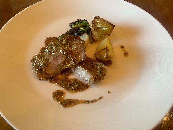 お肉料理も負けず劣らず、湘南豚のロースト。柔らかくジューシーな肉質、そして甘みのある脂身が見事なブランドポーク。粒マスタードの香りと食感が変化を加えます。グリル野菜も、野菜本来の味を引き出す絶妙な火入れ。