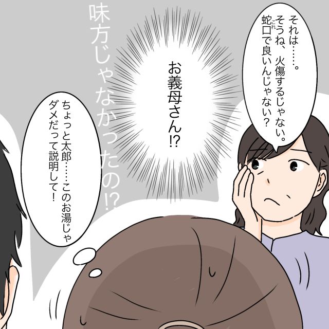 すると、「それは・・。そうね、火傷するじゃない。これで良いんじゃない?」と義母が言い出し、「お義母さん!?味方じゃなかったの!?」と私の頭の中は驚きでいっぱい!「ちょっと太郎・・このお湯じゃダメだって説明して!」と太郎に耳打ちしたのでした。