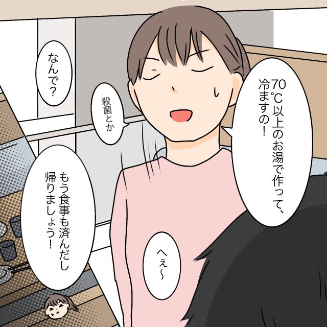 見かねた私が、「70℃以上のお湯で作って冷ますの!殺菌とか」と答えると、「へぇ~」と感心する太郎。「もう食事も済んだし帰りましょう!」私がそう言うと、「なんで?」と太郎が不思議そうに言いました。