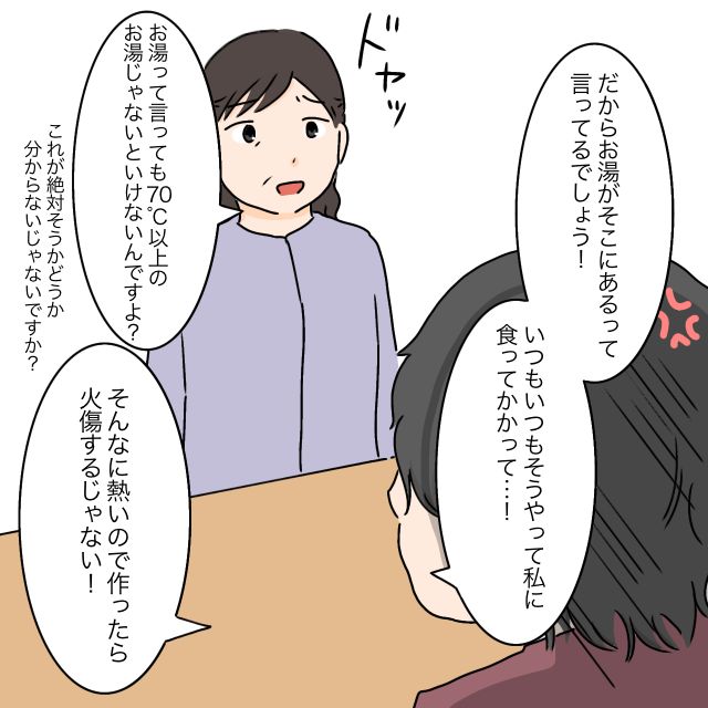 義母にそう言われて「だからお湯がそこにあるって言ってるでしょう!いつもいつもそうやって私に食ってかかって・・!」と怒り出す義祖母。「お湯って言っても70℃以上のお湯じゃないといけないんですよ?これが絶対そうかどうか分からないじゃないですか?」とドヤ顔で言う義母に、「そんなに熱いので作ったら火傷するじゃない!」義祖母がまた怒り出しました。