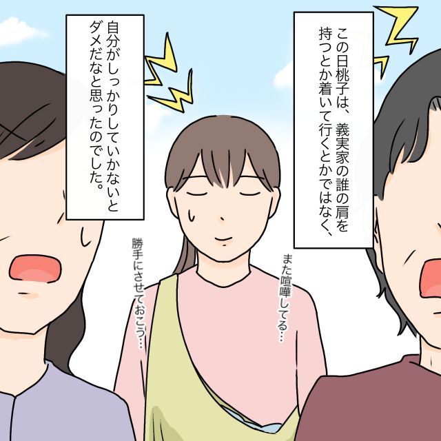 そしてお店を出た私たち。その後も懲りずにケンカしている二人を見て呆れながら、義実家の誰の方を持つとか、着いて行くとかではなく、自分がしっかりしていかないとダメだなと思ったのでした。