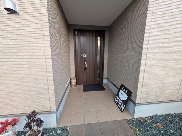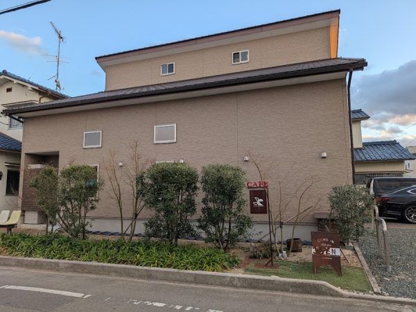 茶色い壁の一軒家がKIKUMARU CAFEさん。 看板が小さいので見落としに注意してください。 店舗横の砂利の部分が駐車場になっているので車を停めて入店。