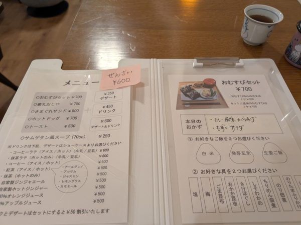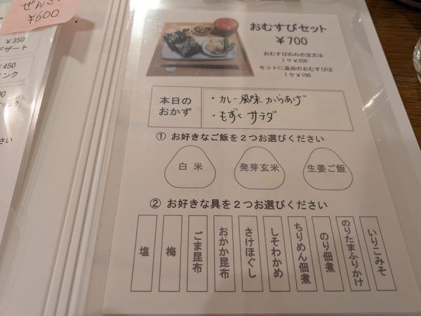もってきてくれたメニューを拝見。 具材が選べる「おむすびセット」(700円)がめっちゃ気になる。 おにぎりの具材が選べるお店はよくあるけど、ごはんも選べるのは珍しい。