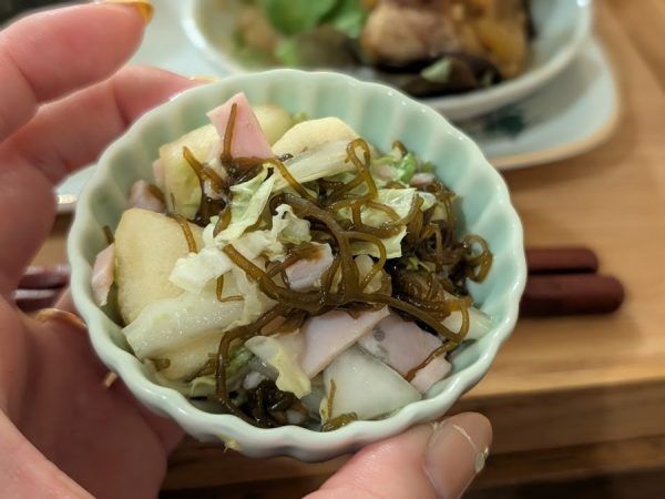 胸肉の唐揚げはカレー風味のタレが絡められて美味しい。 小鉢に盛られたもずくサラダはツルンともずくの食感が楽しめる一皿。 もずくをサラダにした料理は初めてだけどめっちゃ好き。