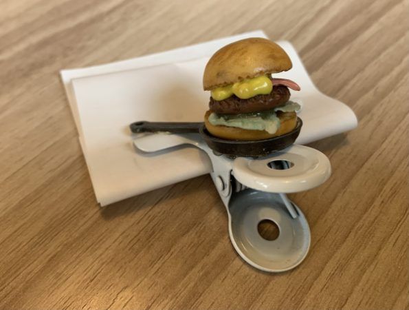 伝票を挟んでいたクリップは、フライパンにのったハンバーガーのミニチュア♪ 超かわいい!