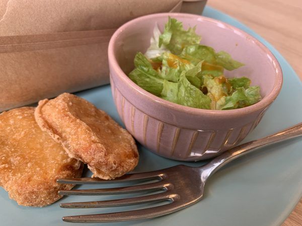 サラダ、ナゲット、ゼリー。 どれも丁寧に作られていて、飲み物も付いて、大満足のセットです。