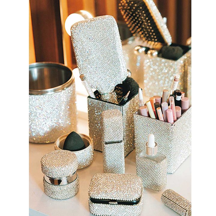 「海外通販でデコレーションをオーダーしました。ペン立てやヘアブラシ、詰め替え用ボトルまで、〝見せる〟ことを意識してラインストーンで埋めつくしたきらびやかなデザインに♡いつも使う香水やクリームなども、オリジナルの詰め替えボトルにわざわざ入れ替えて使用しています。生活感の出やすいゴミ箱も同様のデコレーションにして。とことんこだわりました」(中村真優さん/29歳・広報関係)