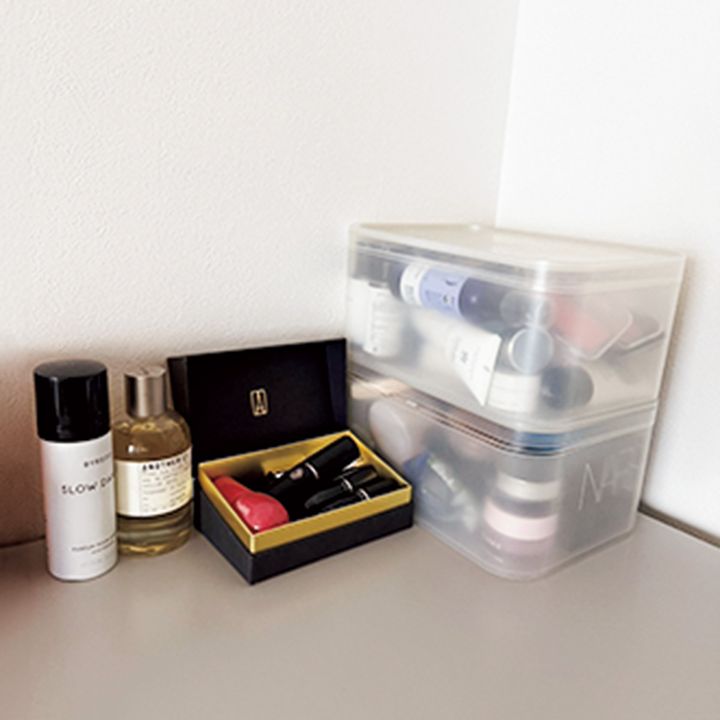 「コスメは少数精鋭派でアイテムが少ないぶん、逆にパラパラ見えてしまうため、クリアボックスがあるとまとまりよく収納ができるので重宝しています。中身も可視化できて、サイズの違うアイテムごとに箱を分けて収納できるから助かっています」(安藤えりかさん/30歳・腸活サロンオーナー)