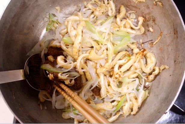 ウーさんの料理では、素材の切り方にもこだわりがあります。千切りは、水分が出すぎず、味が染み込みやすい切り方だとか。スライサーで簡単に切れるのも魅力です。さらに、すぐに煮えるので、調理時間は10分ほどでした。