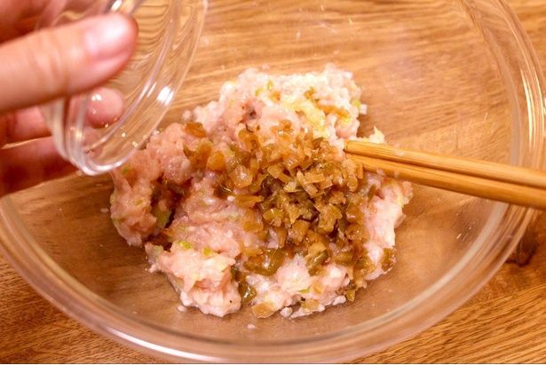 黒こしょう、しょうが、長ねぎなどを刻んで入れます。風味づけ、くさみとりなど、それぞれに役割があるので、ひとつ入れるたびによくまぜるのがポイント。古漬けのザーサイは中国料理らしい素材。これを入れると、スープに深いうまみが出ました。